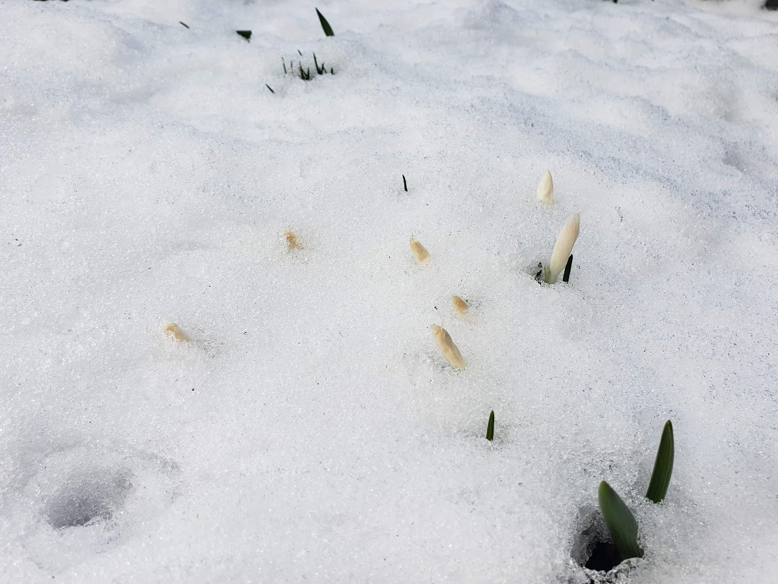 The snow melted, and this crocus, Crocus tommasinianus ‘Albus’. flowered.