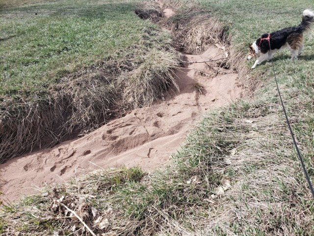 The guy I live with said he would have scooped out some of the sand, for potting mix, but the water that flowed here came from streets, so it could have oil and “other gunk” in it.