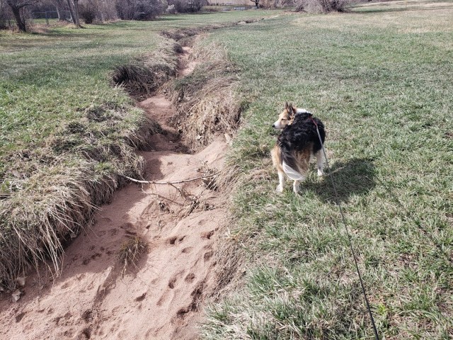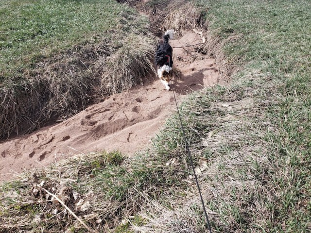 Where all the sand comes from is a complete mystery, though maybe it comes from the native soil, which is pretty gritty. We don’t walk along the creek nearly as much as we used to, because now there’s a dog that jumps the fence along the way.