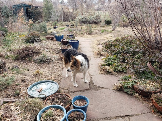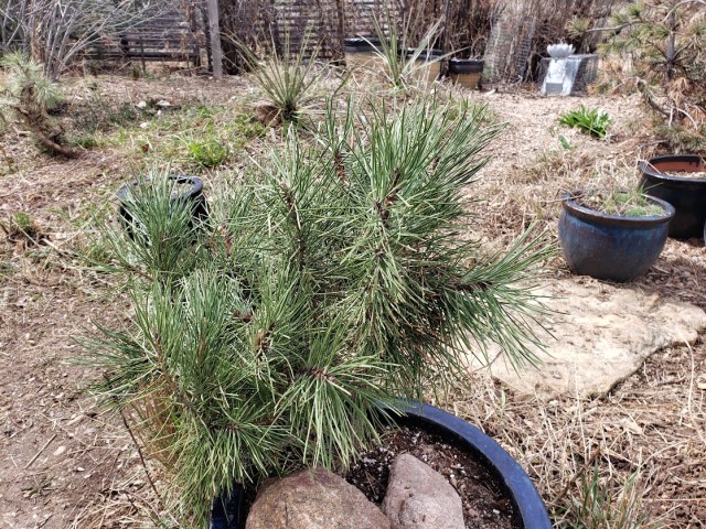 In the background, you may spy a pot with a conifer in it. The guy I live with dug up one which had fallen on its side and was being smothered by other plants.
