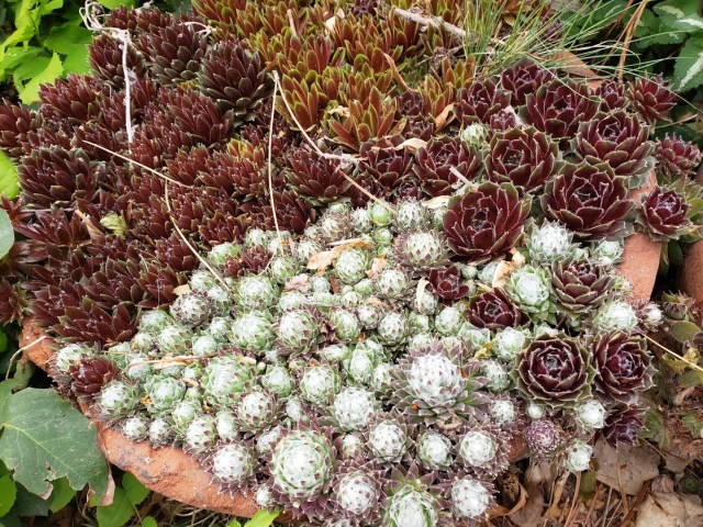 At one time we were able to acquire unglazed Italian “dish” garden pottery made from a special gray colored clay that was virtually frost damage proof. Have not seen it available in years. Left two dishes, also full of hens and chicks, in the CT garden. Ho-hum.