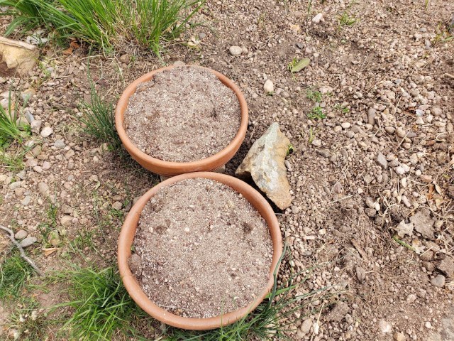 I’ve already talked about “drainage” (the guy I live with gets irked when people talk about that, like it’s something that actually happens), but in this case it’s important for water to drain out of the dishes, of course, and the perched water table discussed in the post I mentioned in my introduction won’t be an issue because the soil-less mix here is highly pervious to water.