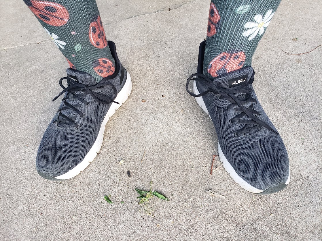 Here’s a picture of the shoes, and his very stylish compression socks with ladybugs on them, which the doctor said to wear because of the aftereffects of radiation therapy several years ago.