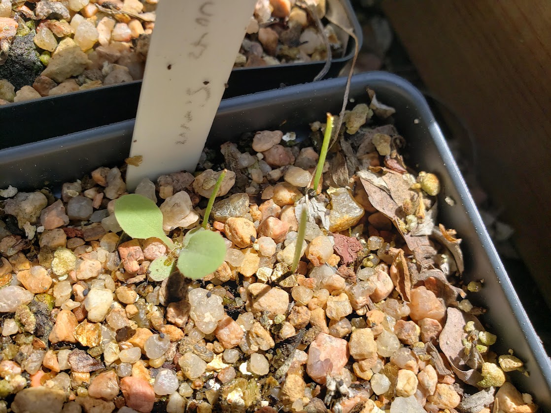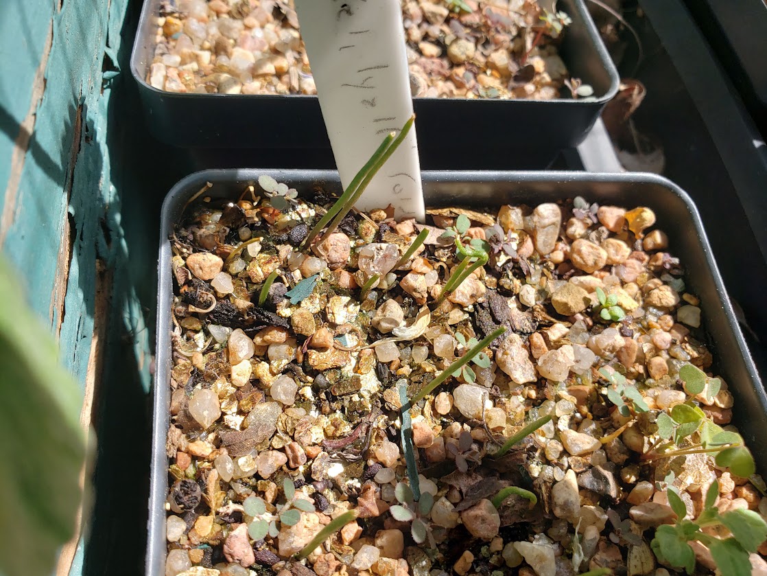 You can see one seedling (Calcohortus gunnisonii) in front of the label in the first entire pot in the middle row, on the right. It looks like grass. This must have been one that didn’t germinate after being stratified.