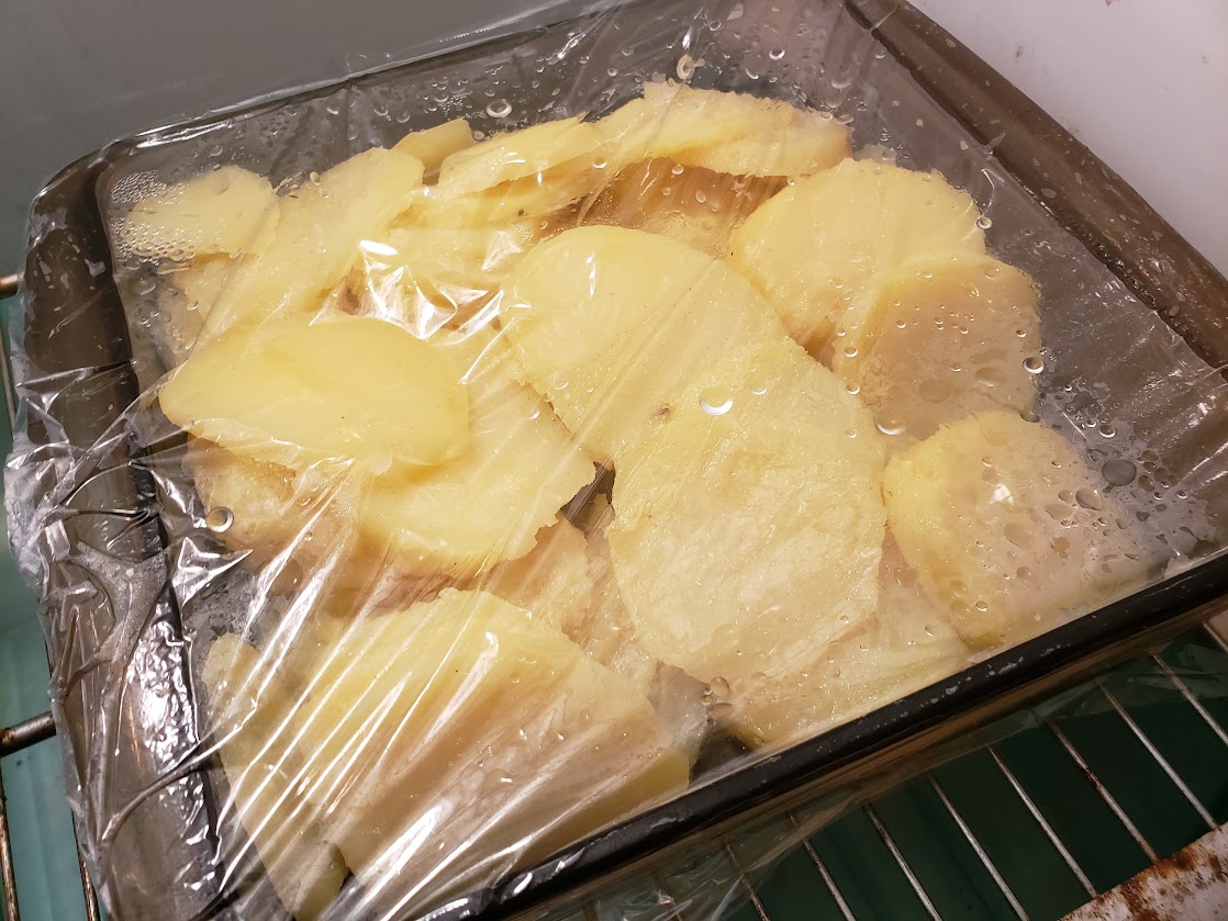 Next time he’ll peel the potatoes first, then slice them and boil them, like he does when he makes gratin dauphinois.