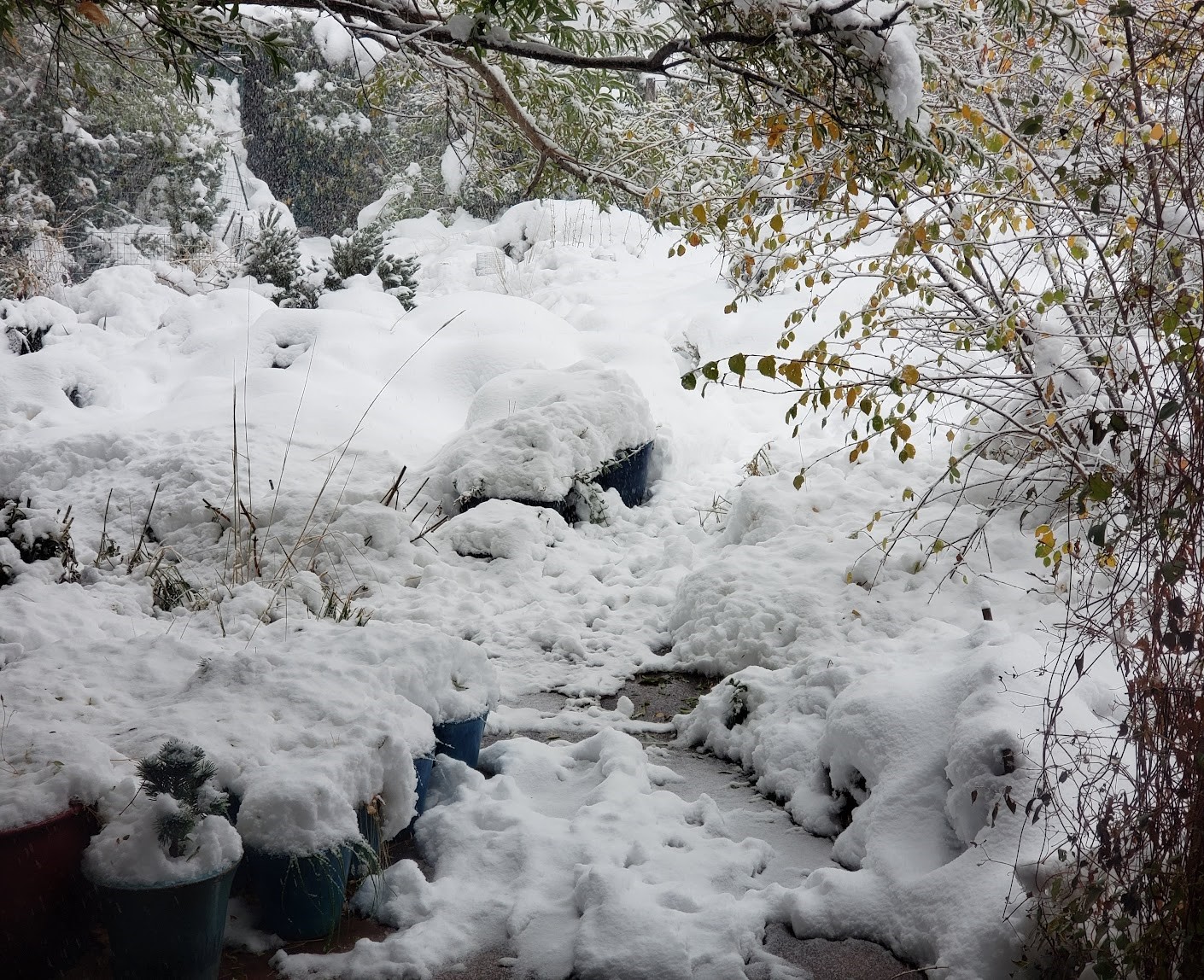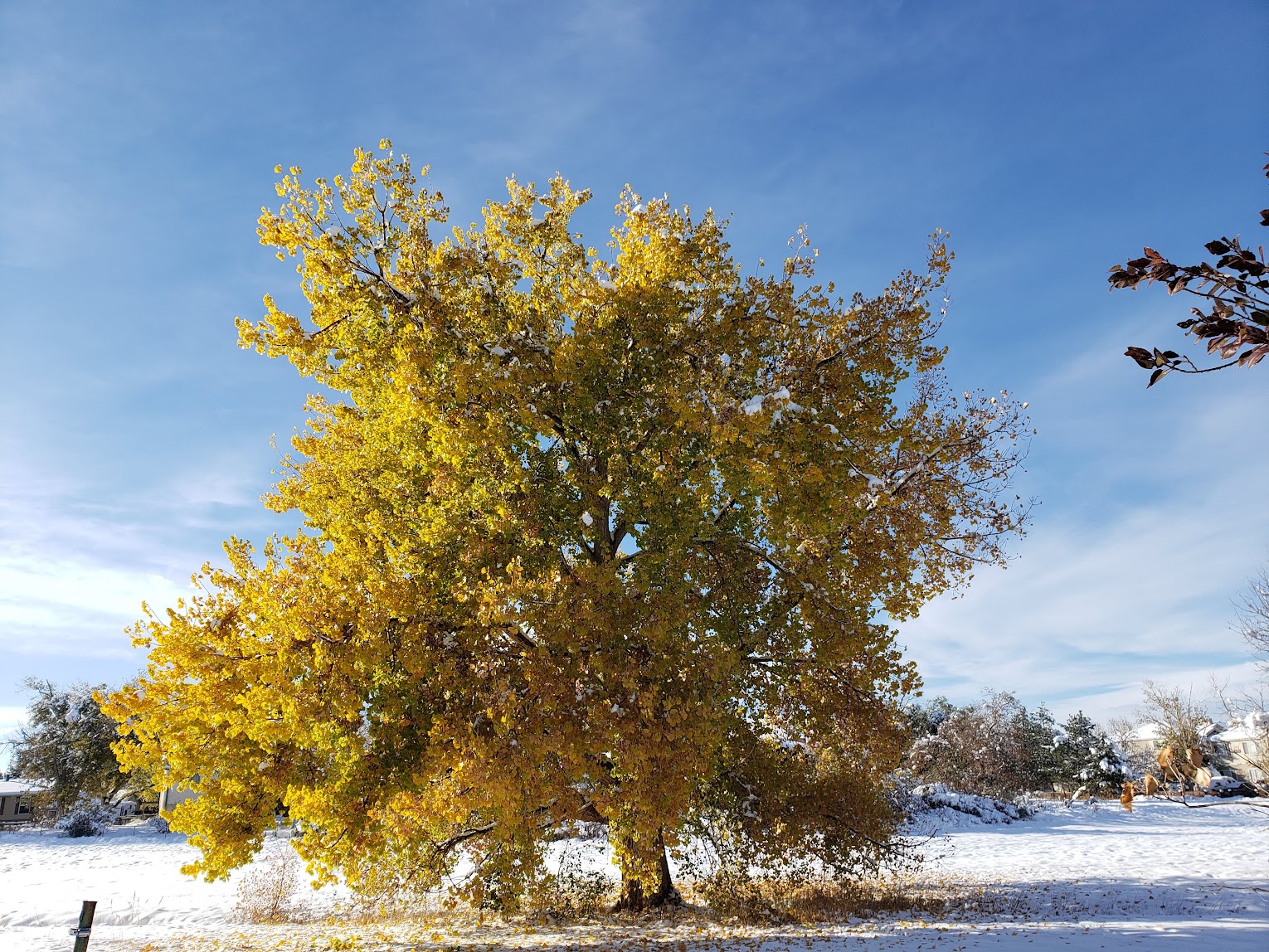 The guy I live with said there may be broken branches on the cottownwood but it still has most of its leaves, which is weird, but maybe it wasn’t cold enough before it snowed for the tree to get its cue to drop its leaves.