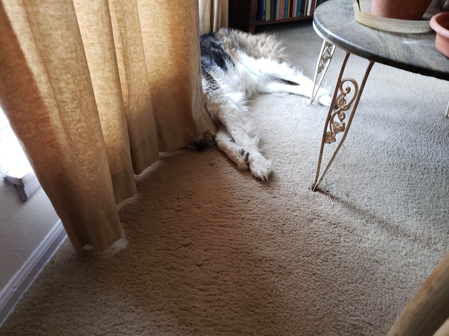 The guy I live with is talking about getting new drapes for the living room, too, because he says “a certain party” chewed the bottoms of the drapes “when he was a puppy”.
