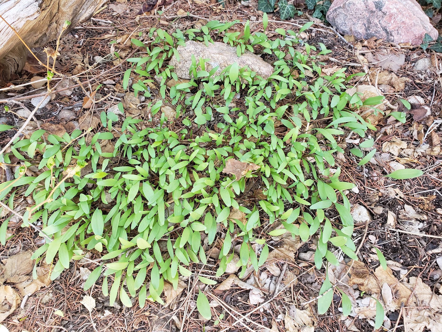 Some time around the beginning of last winter he sowed a bunch of seeds of Fritillaria pallidiflora which he had collected from plants in the garden. He just sprinkled the seeds on the ground, and a couple of weeks ago he noticed this: