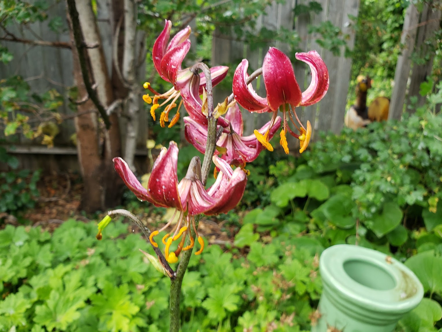 So, let me get this straight. The seedling emerus is yellow. Lilium martagon is blooming. It rained. The broken birdbath is still broken. . . . and that is it?