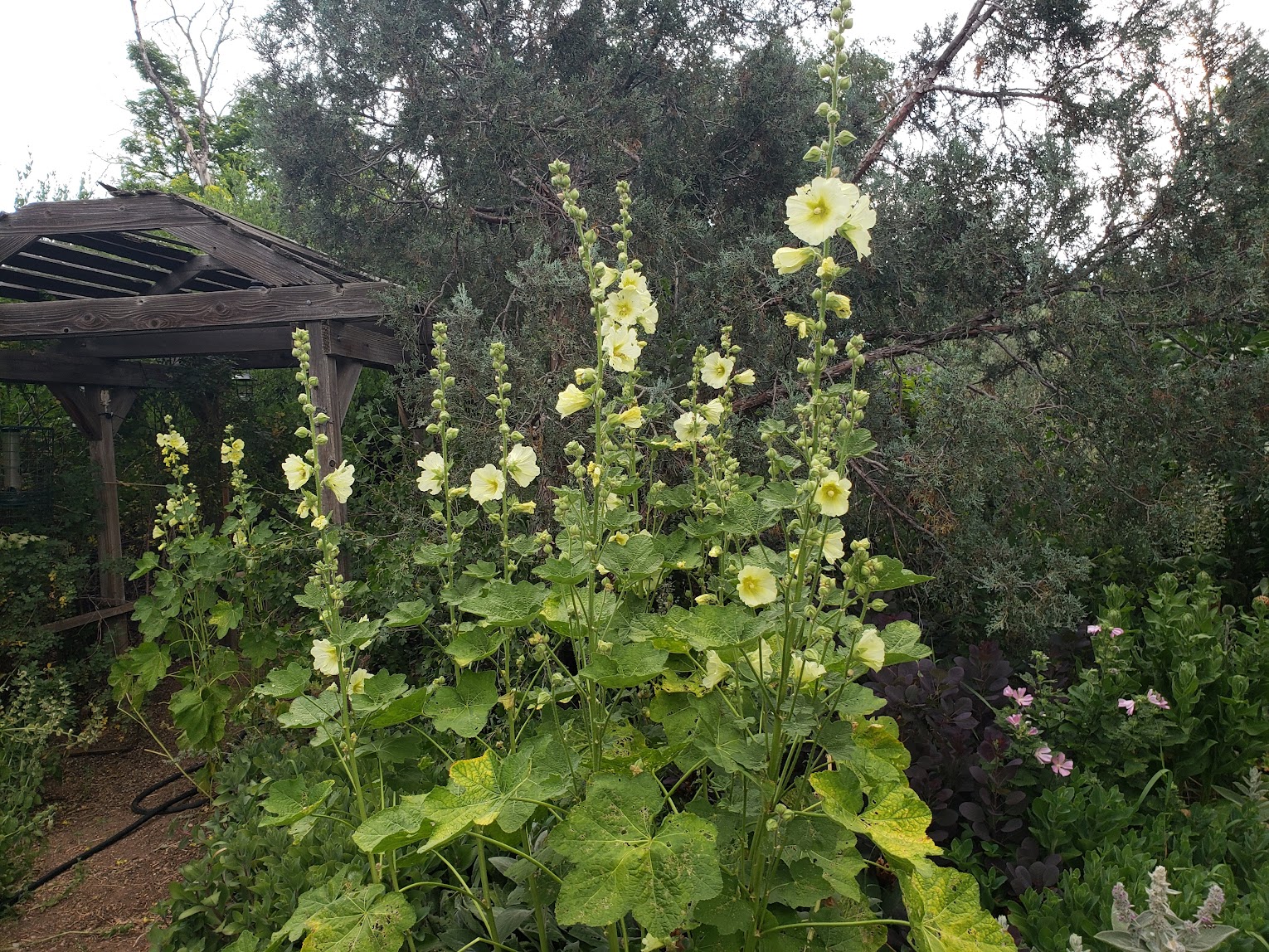 There are, or were, beautiful regular hollyhocks growing in alleys in Englewood; one time the guy I live with and his wife walked down some alleys and collected a bunch of seeds. The plants don’t need much watering at all.