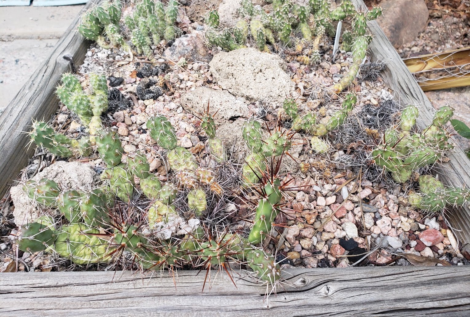 Here are a bunch of little cactus in a wooden trough on our driveway. These are mostly Opuntia fragilis.