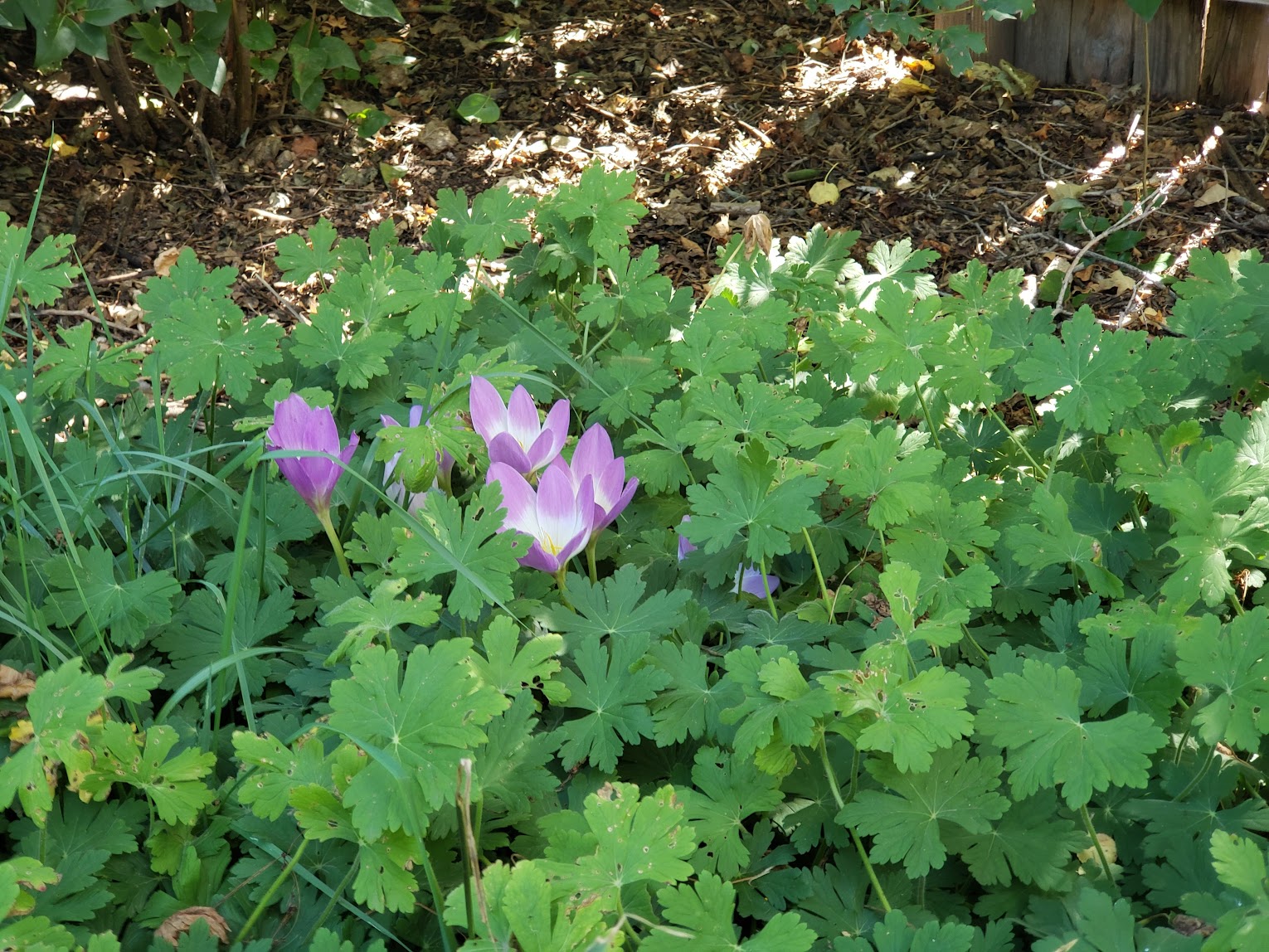 Now I’m going to talk about colchicums. They’re planted all over the garden, some in sun and some in partial shade, but most of them are planted here, among the Geranium macrorrhizum, which the guy I live with likes the smell of.