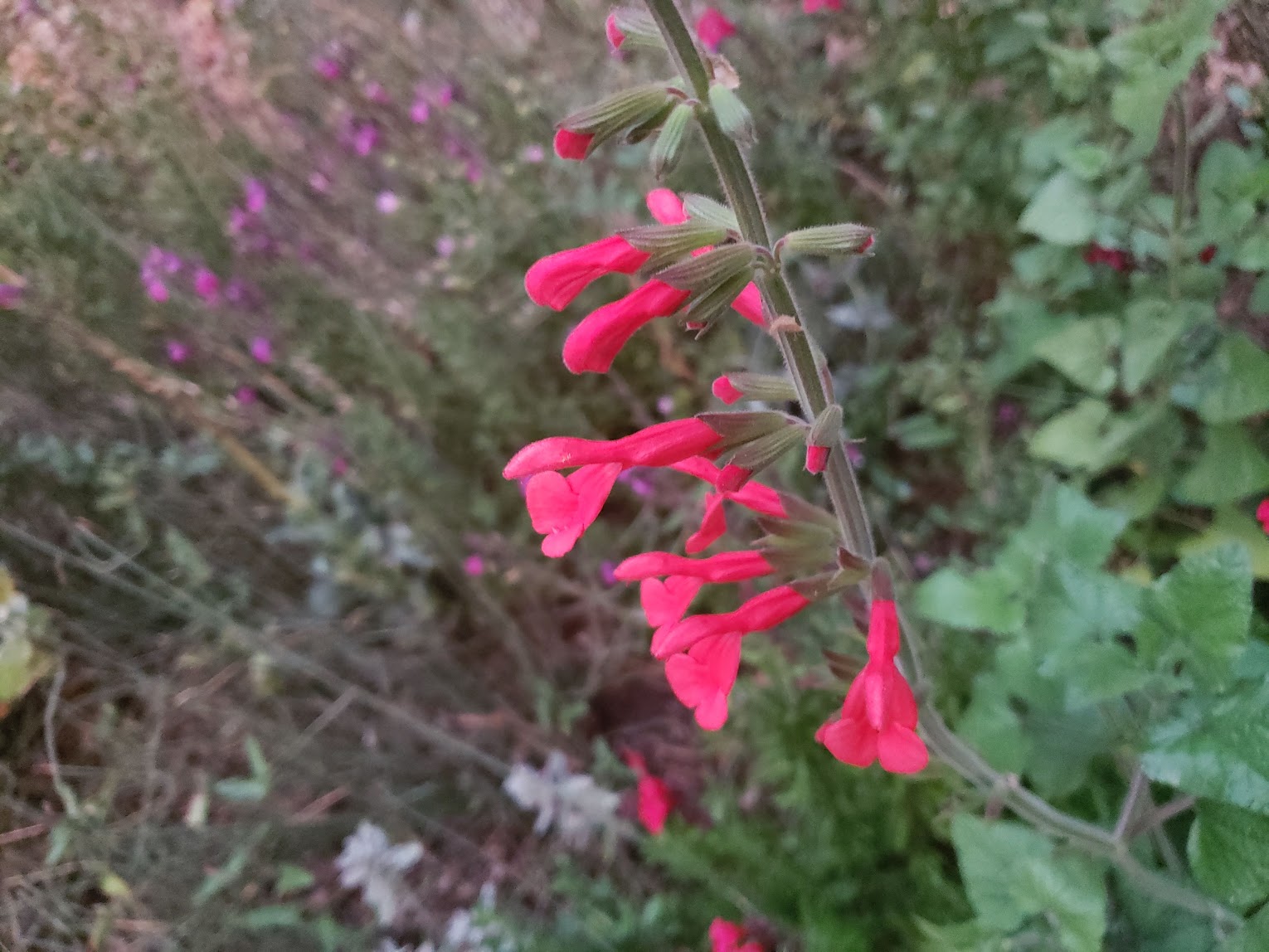 The most conspicuous buffet selection here now is Salvia darcyi. It was wilting pathetically a couple of days ago so the guy I live with turned on the hose and pointed it right at the bases of all the plants. He stood there for a while, watering.