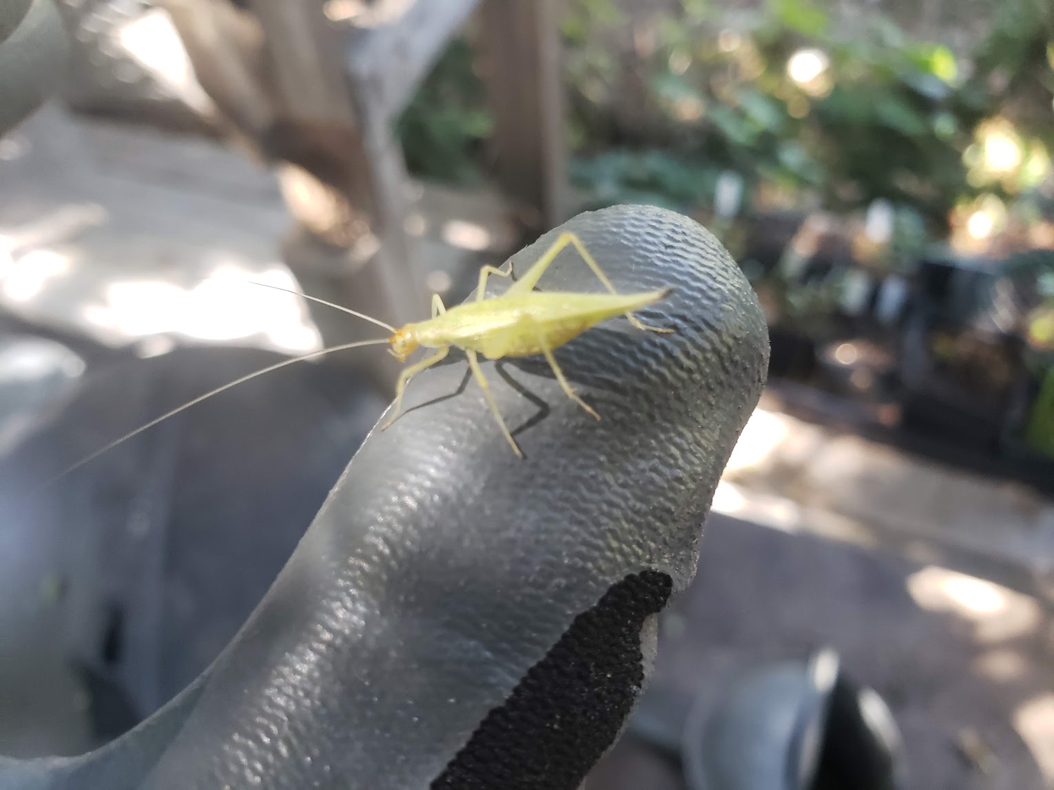 I’ve said before that the guy I live with and his wife would walk around the apartment complex at night, on the sidewalk where there are shrubs, and they would listen for katydids and then try to spot them, which wasn’t easy.