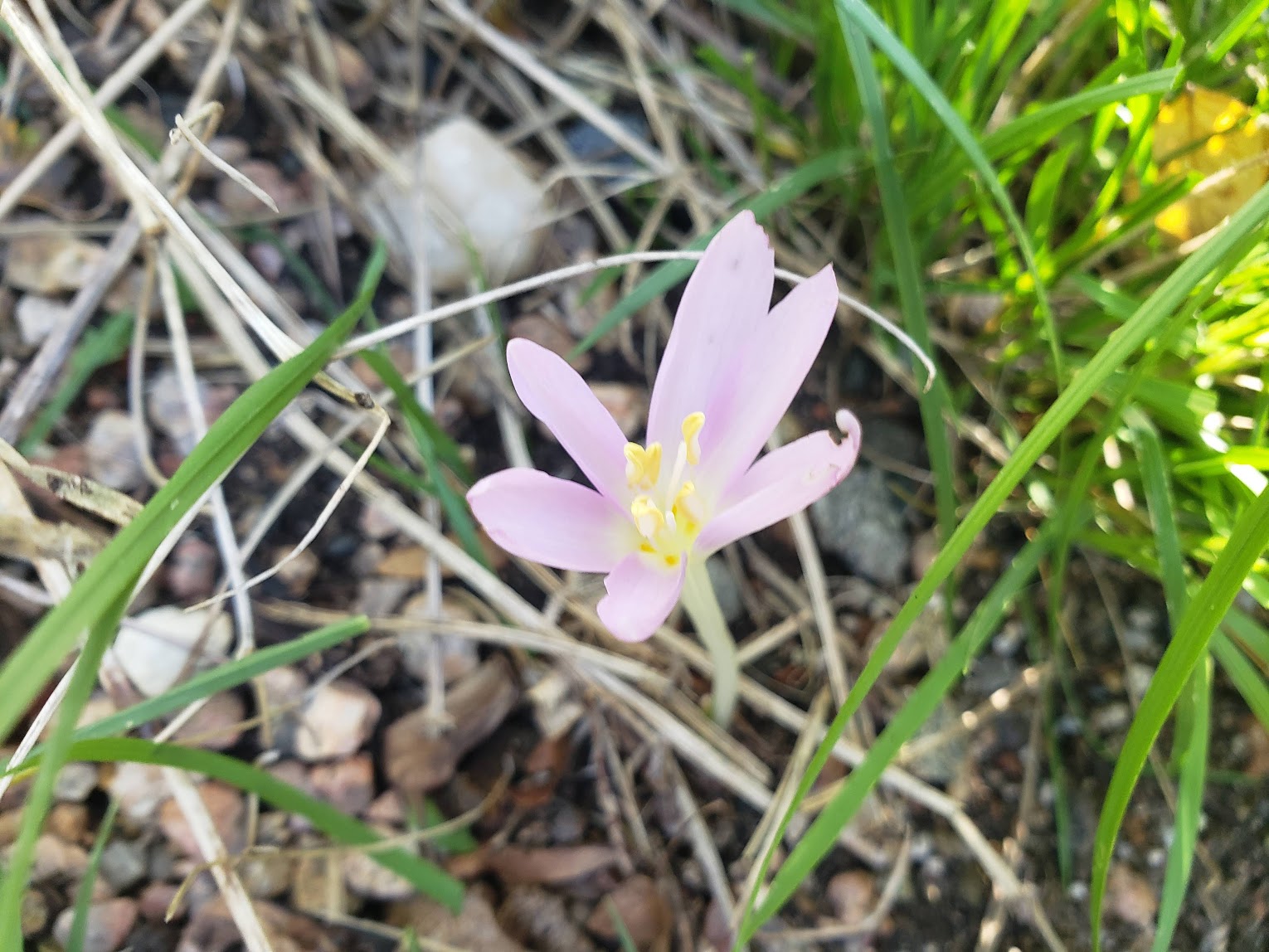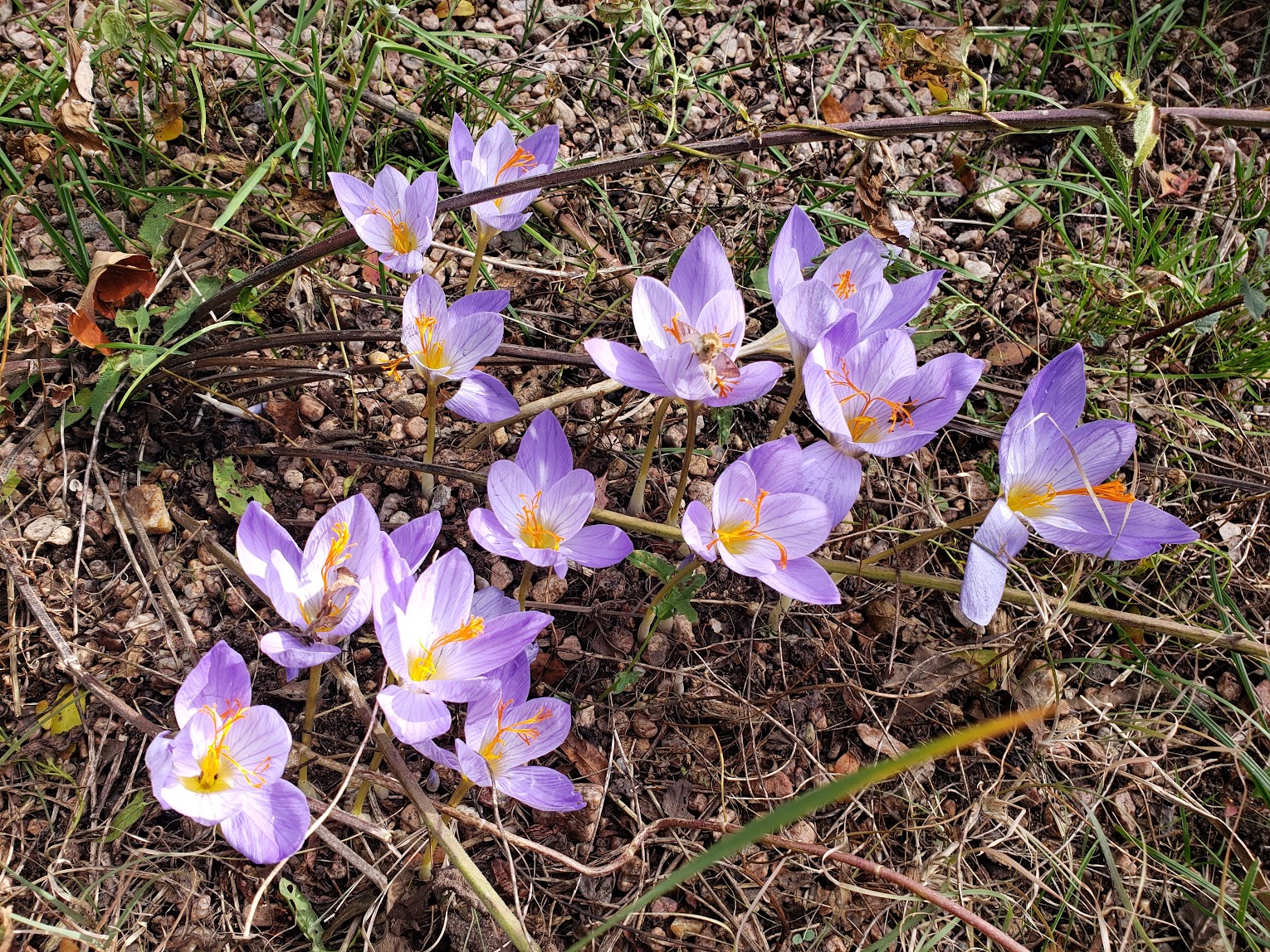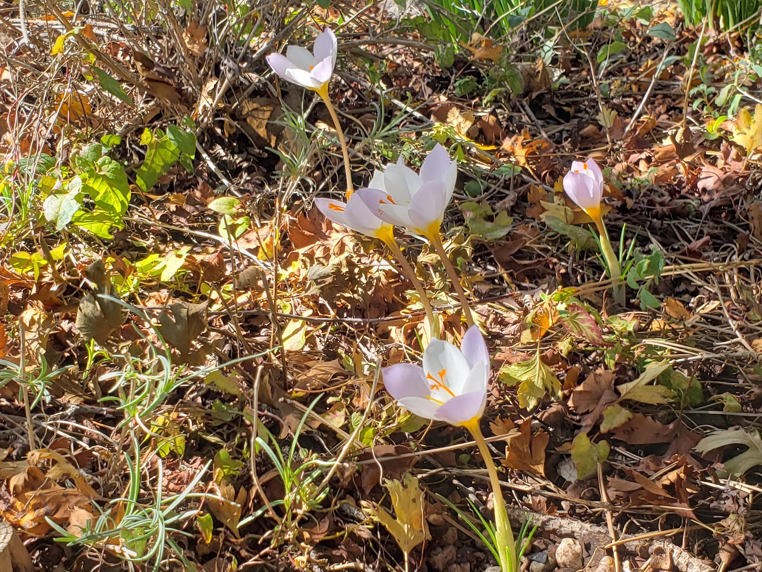 This is another one where the leaves appear in the spring. One problem with this crocus, which is super-easy to grow here, is that the “mother corm” can make dozens of “daughter corms” that are so tiny they take years to reach flowering size.