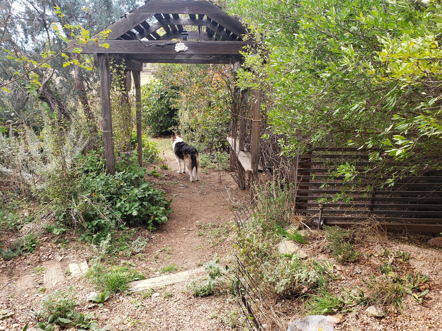 The guy I live with’s wife built that arbor. He dug the post holes. You can see the squirrels have gnawed a lot of the flats on top, and eventually (as usual) they’re be replaced. There’s a bench for visitors, but no one has sat on the bench for a very, very long time.