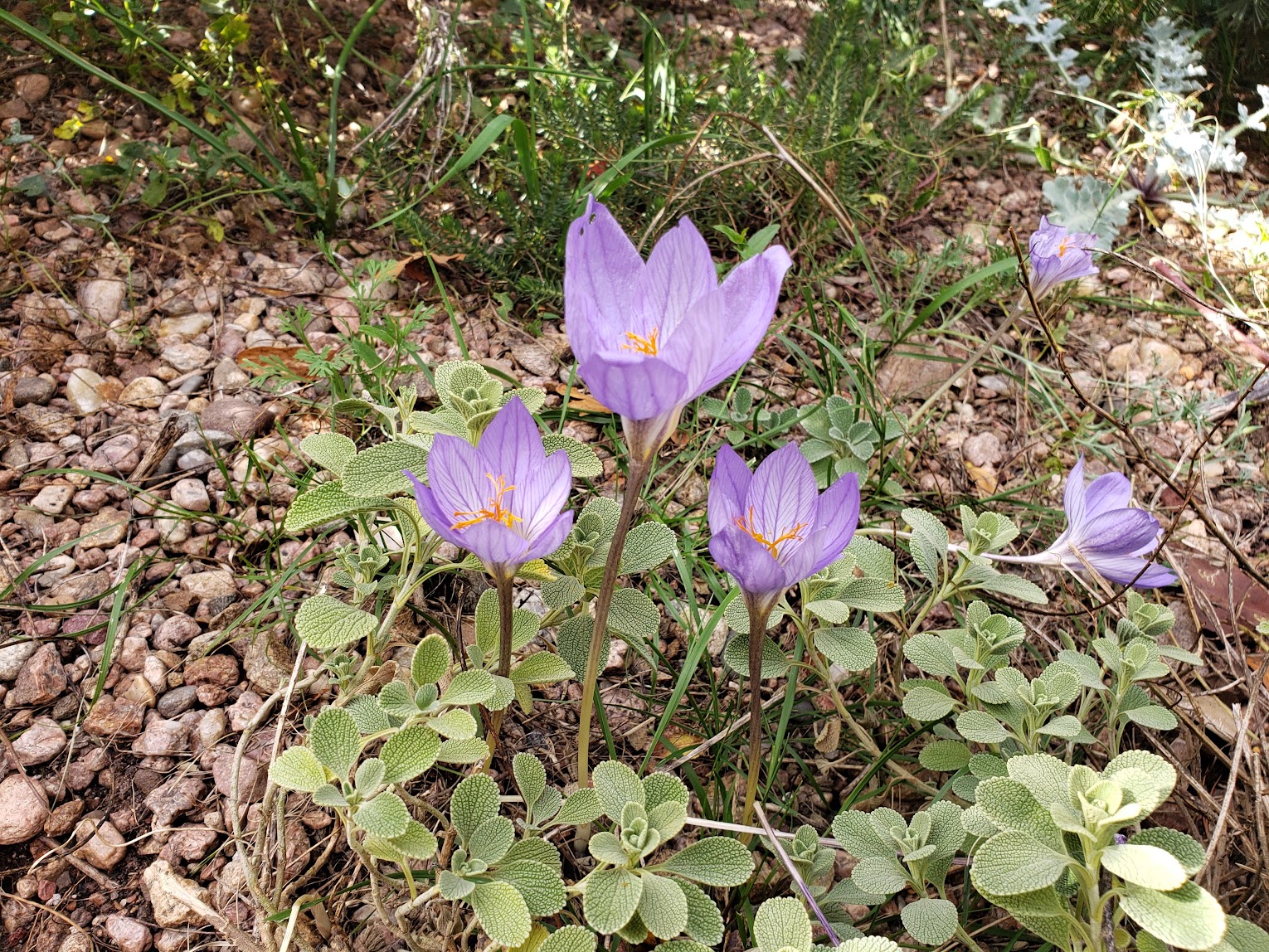 Crocus cartwrightianus is the ancestor of the cultivated saffron crocus, Crocus sativus, but that flowers later here.