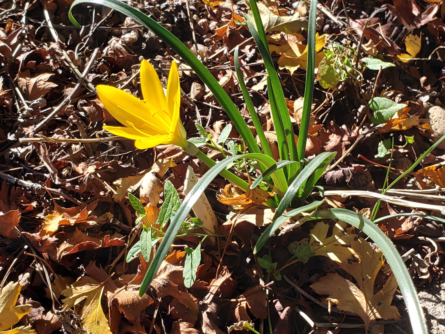 The leaves are narrower and floppier than those on Sternbergia lutea, and “for some dumb reason” the guy I live with, who should know better according to him, kept thinking about sickles.
