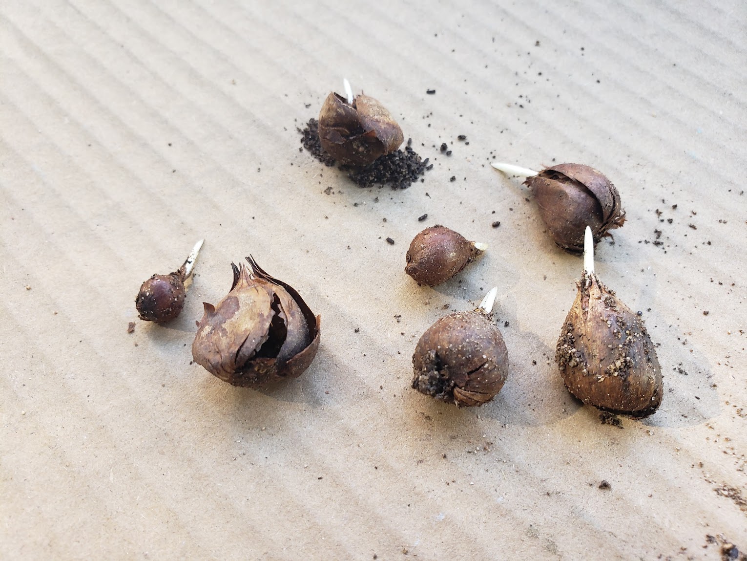You can also see that something is missing. The energy of the emerging flowering shoot is going to be sapped if the corm can’t pull water from the soil via roots, so he replanted these and watered them thoroughly. Maybe we’ll check on them in a week.