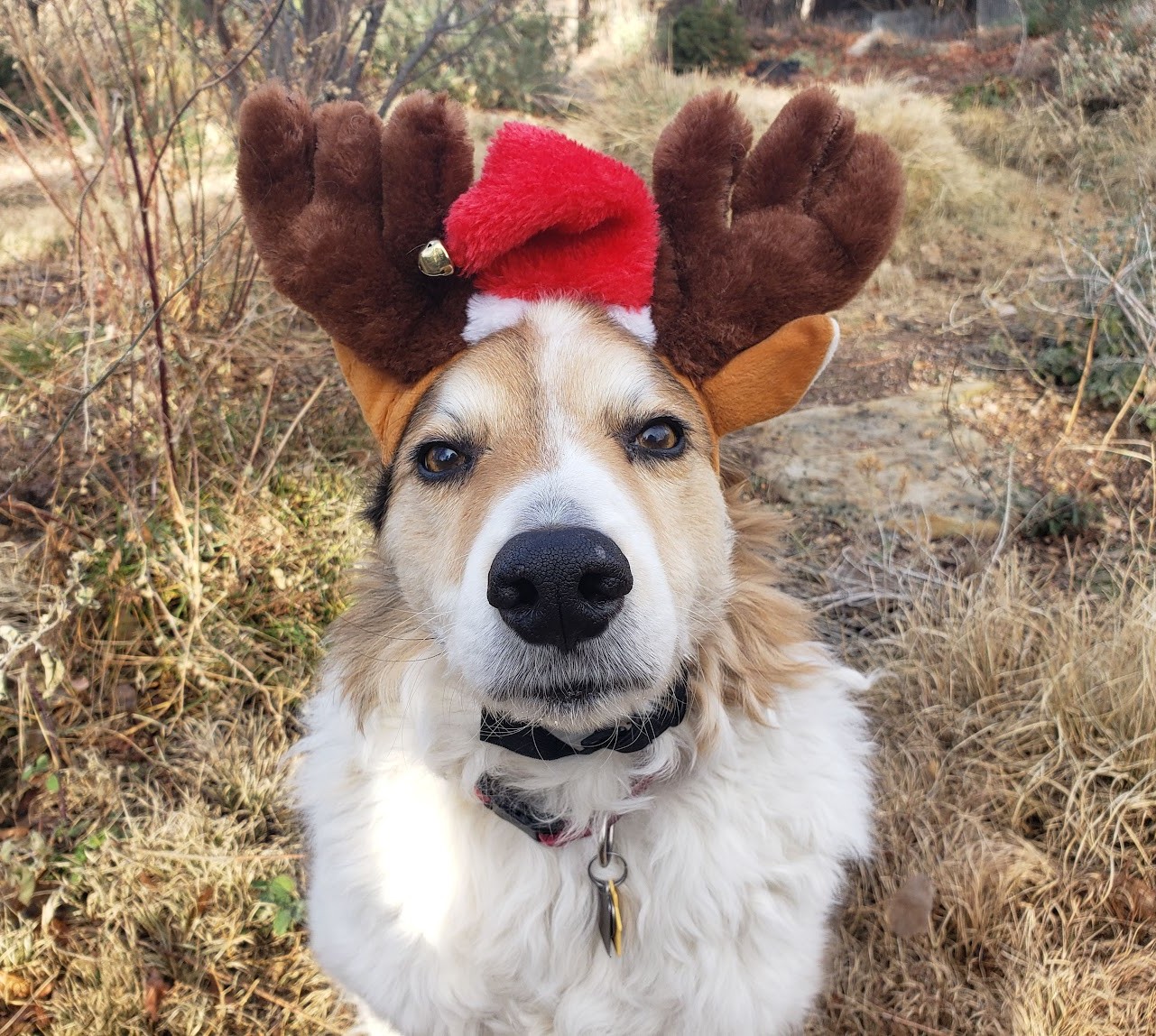 Merry, Merry Christmas! But what has been done with Mani? This is clearly a photo of a reindeer in Border Collie’s clothing. 🎄