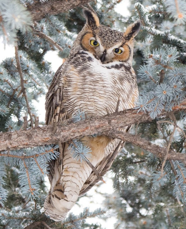 It snowed on and off yesterday, and in the afternoon the guy I live with got out the DSLR camera to get yet another owl picture. I think you can tell the difference between this one and the ones taken with the point-and-shoot. I wasn’t with him, so he didn’t have someone tugging on his arm the whole time.