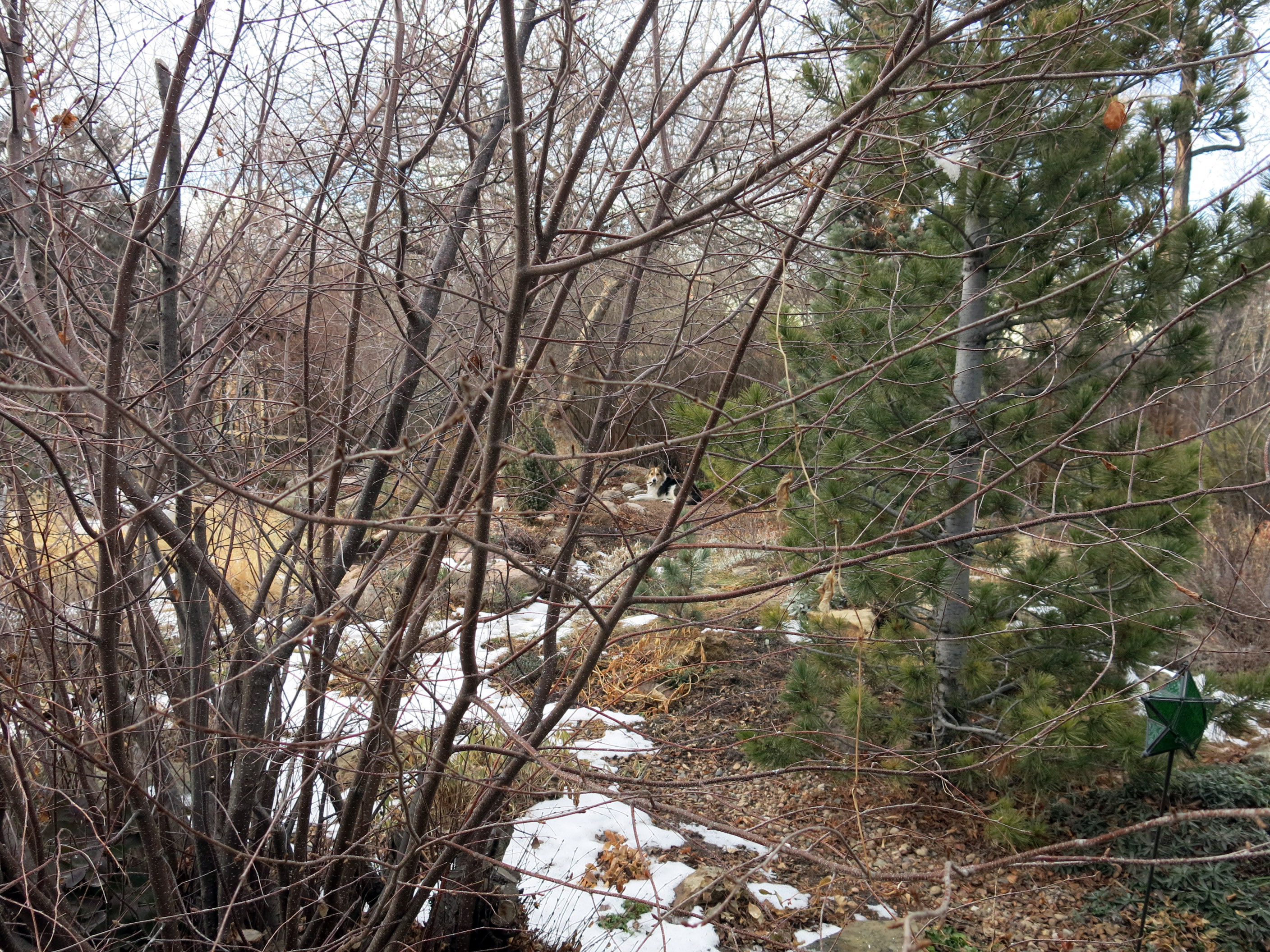 If you think that looks cold, it’s because it is. Those are pinyons, Pinus edulis, on drip (which is weird because they don’t need to be watered at all here). Last autumn the cones were full of nuts. The guy I live with talked about taking them home and roasting them, but he said collecting them was a sticky business, and he didn’t have a bag to carry pine nuts in.