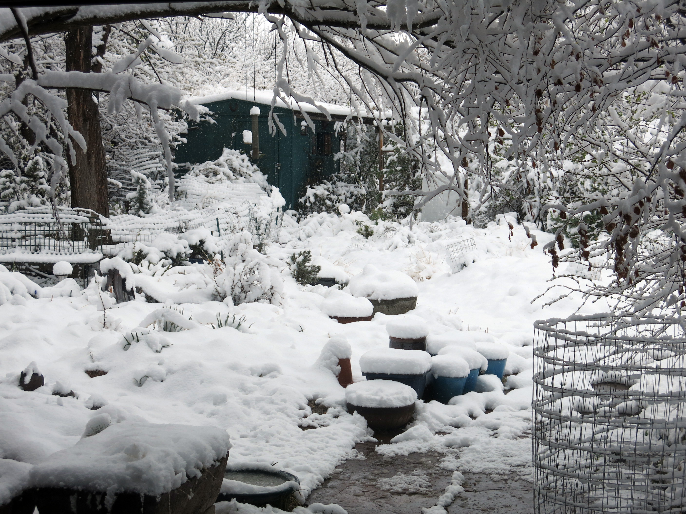 And a small order of hens and chicks came, from Shadow Mountain Succulents. The guy I live with said that there were too many cactus in the garden, many of which never flowered because the summers here are so dark, and that, after thinking about it for at least six months, he decided he liked hens and chicks better. So they were planted in the glazed pots you see in a lot of pictures of our garden, with some hardware cloth tents on top, because squirrels will eat the hens and chicks to pieces if they’re not protected before they root into the soil.