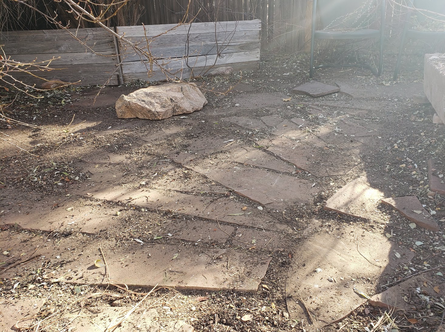 Behind the shed is the trough patio. You can now see the pattern laid down by the guy I live with’s wife.