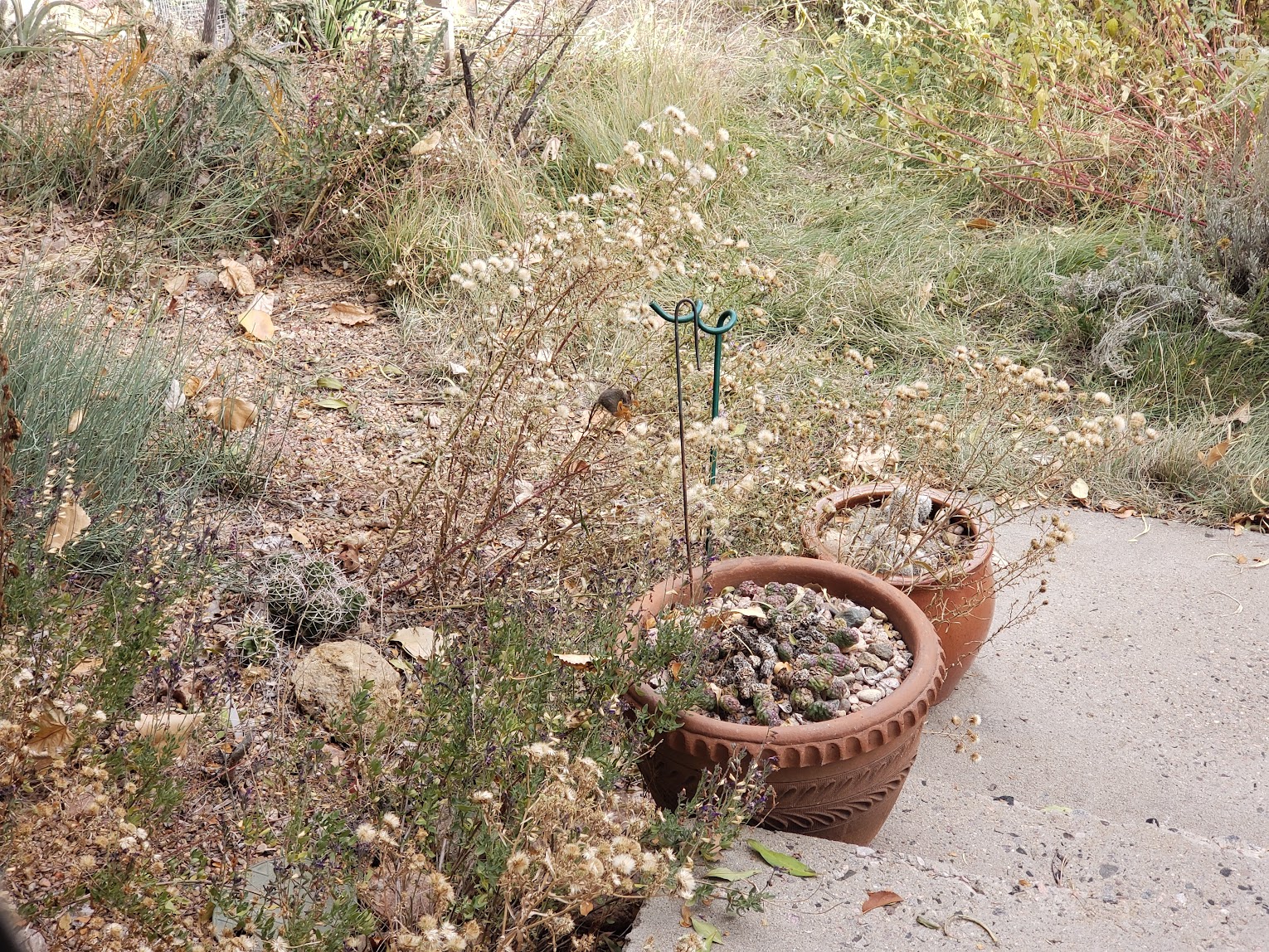 The low fences hide a bunch of cinder blocks on which the troughs sat. You can see that there are still two troughs, on the right. There are two eriogonums in the closest trough, but the farthest trough has no plants in it. For now.