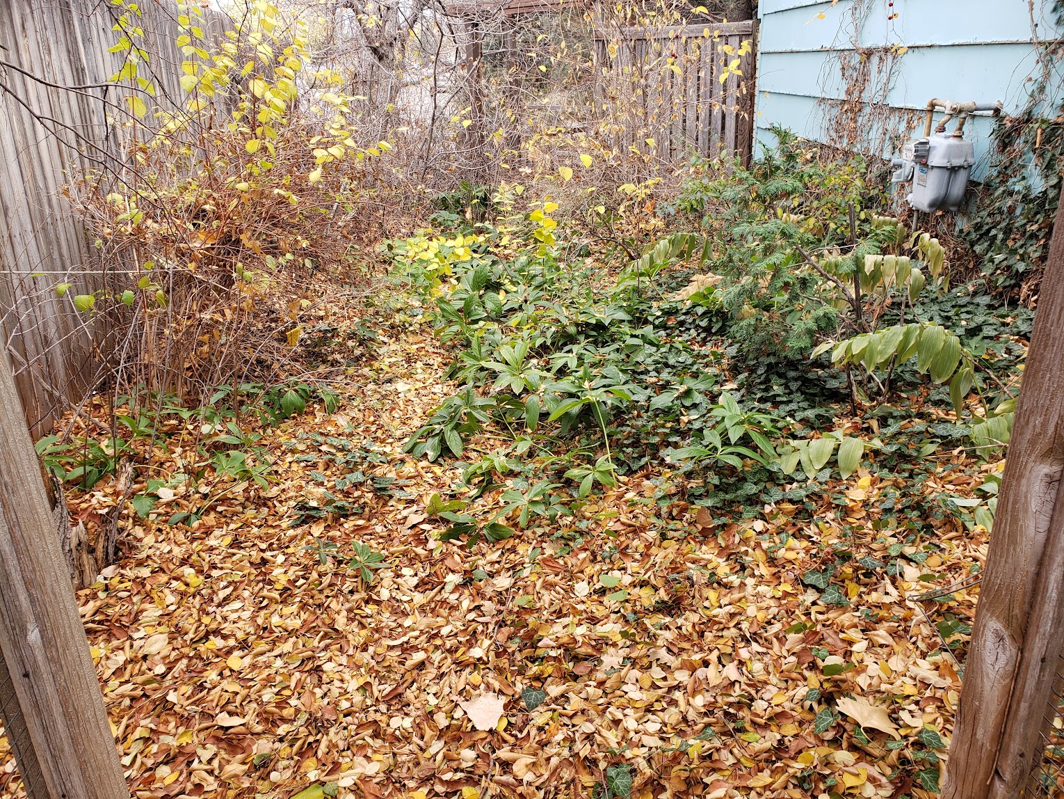 The enclosure is full of leaves, too. A lot of the leaves were raked into this little garden.