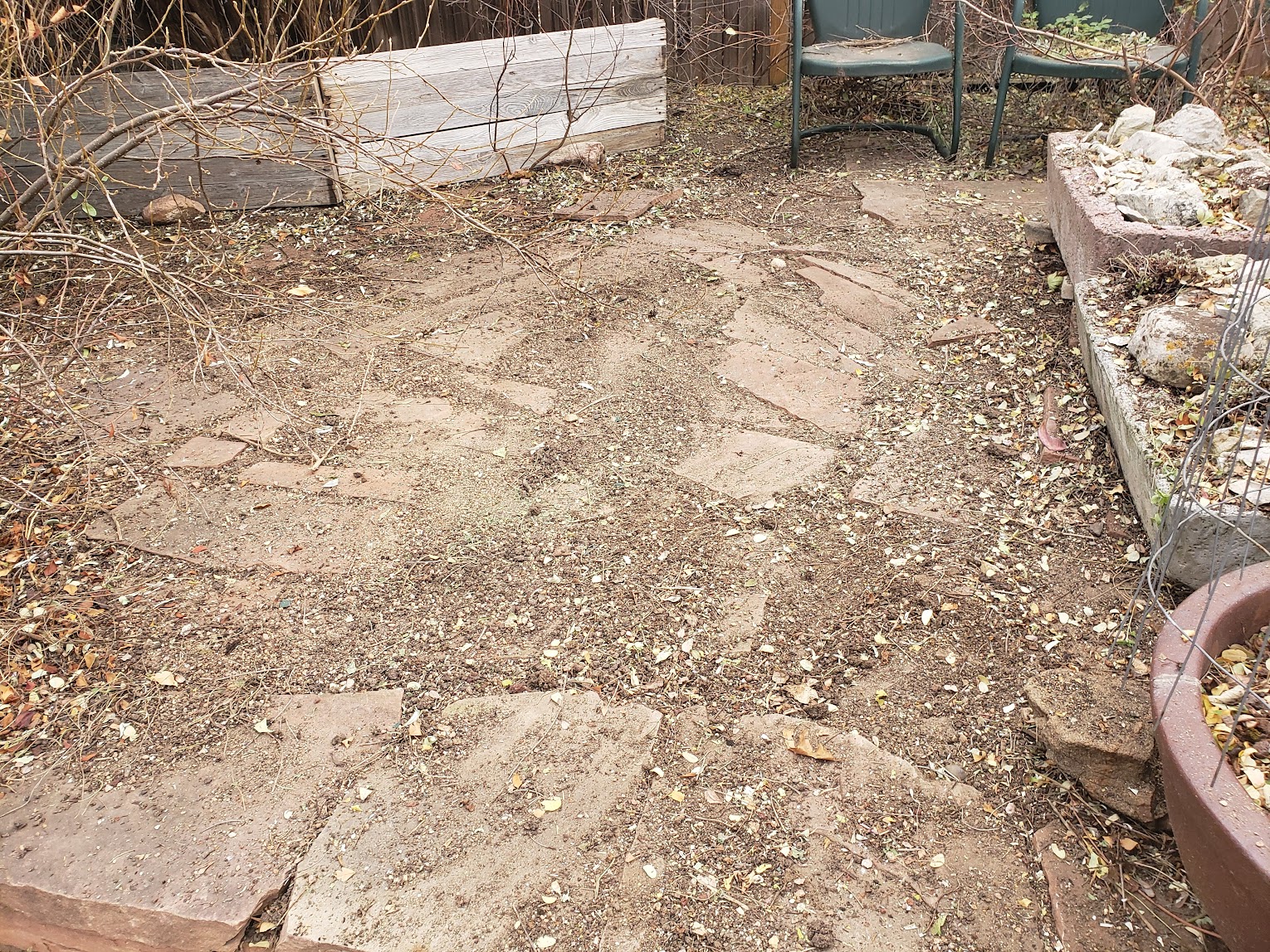 All the dirt is from the soil-less mix from the seed pots. When this is all swept up it will be apparent that the narrow triangular pieces of flagstone are laid out like the rays of the sun.