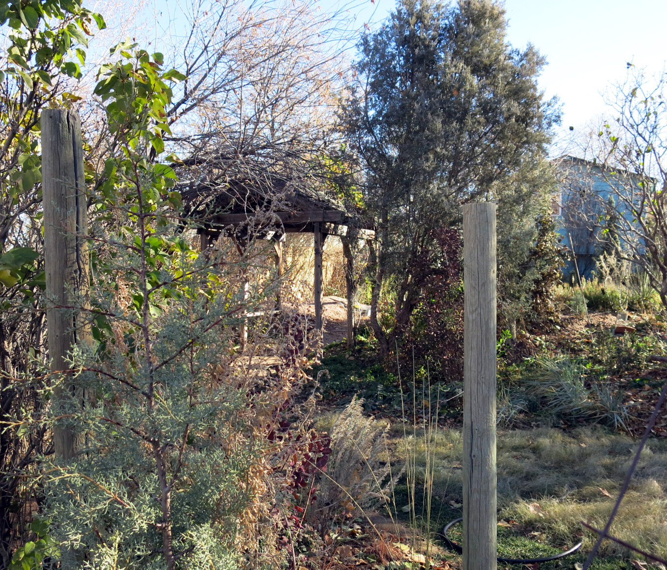 So it’s planted now. The guy I live with said he had “moderately high hopes” for its survival. The soil has been dug and re-dug over and over again in the part of the North Border, but it lies over a layer of caliche which is almost impenetrable. He says he could have dug through the layer of caliche down to the natural soil, which is a gritty sandstone-clayey sort of stuff, but he didn’t feel like digging down that far. The border has always been a very dry one, but ‘Grace’ is said to be able to tolerate these conditions. The guy I live with thinks “rejoice in” would be more encouraging than “tolerate”, so we’ll see.