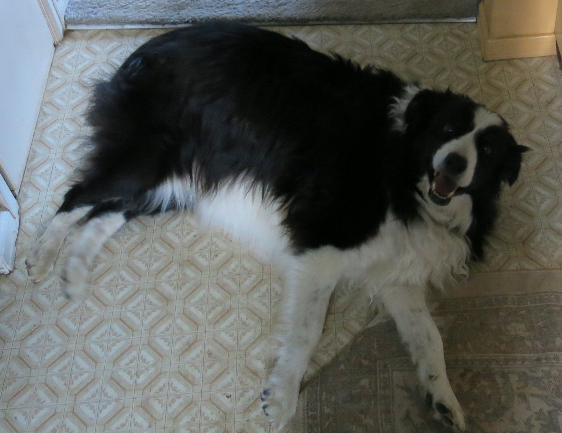 Greetings, everyone. It is I, Chess the purebred, highly intelligent border collie. You may remember me from such enjoyable posts as “Another Lonely Day” and “Stinker’s Revenge”. Here I am after my dinner at Le Splendide Hôtel where I live; my waiter hasn’t cleared the table yet.