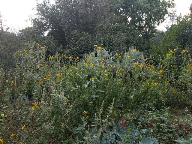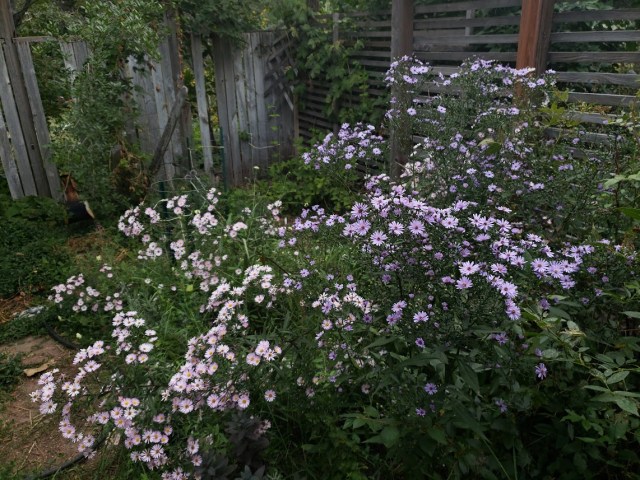 This is me, if you couldn’t tell, not paying any attention to Aster oblongifolius. These asters are all over the garden and are flowering now. They don’t need any supplemental irrigation. There are some cowpen daisies, too.